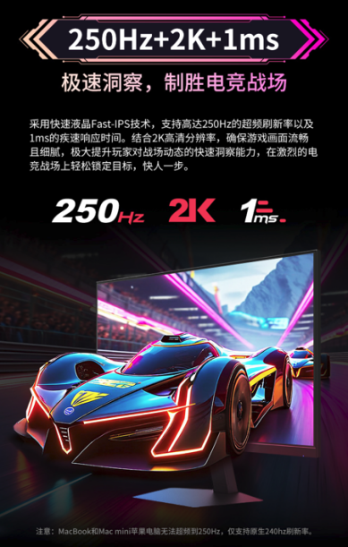 相比传统60Hz或144Hz显示器,250Hz刷新率可将画面更新频率提升至每秒250帧,极大减少画面撕裂与卡顿现象,确保每一次鼠标移动、每一次技能释放都精准呈现。1ms响应时间则有效降低动态模糊与残影,提升目标识别效率,尤其适合高强度竞技游戏。