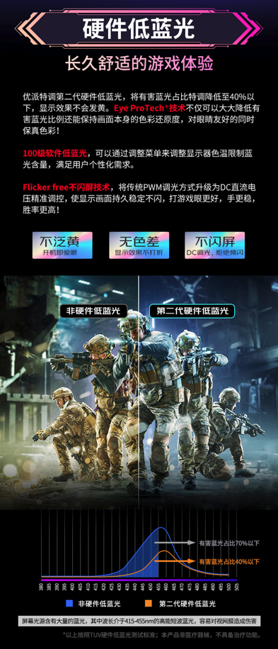 电竞玩家往往需要长时间专注于屏幕,眼部健康成为不可忽视的问题。VX25G26-2K特调了第二代硬件低蓝光技术,通过物理方式减少有害蓝光波段输出,相比传统软件滤蓝光方案更稳定、不偏色,将有害蓝光占比特调降低至40%以下,显示效果不会发黄。