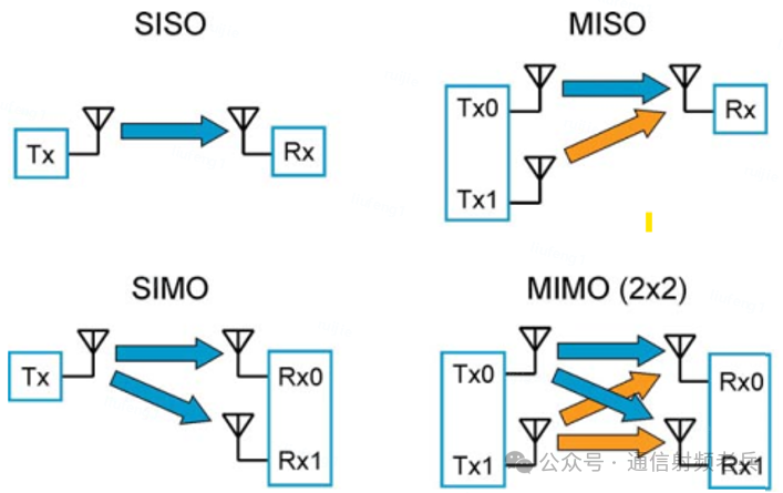 图1显示了发射和接收天线的四种配置。每台设备上有一个天线的基础系统被称为单输入单输出(SISO)。这是各种无线电应用中最简单且最常见的天线配置。添加第二个发射天线,就得到了多输入单输出(MISO)。将第二个天线放在接收器上,就有了单输入多输出(SIMO)。最后,在发射器和接收器上都使用多个天线,我们就有了多输入多输出(MIMO),这是我们将关注的配置。