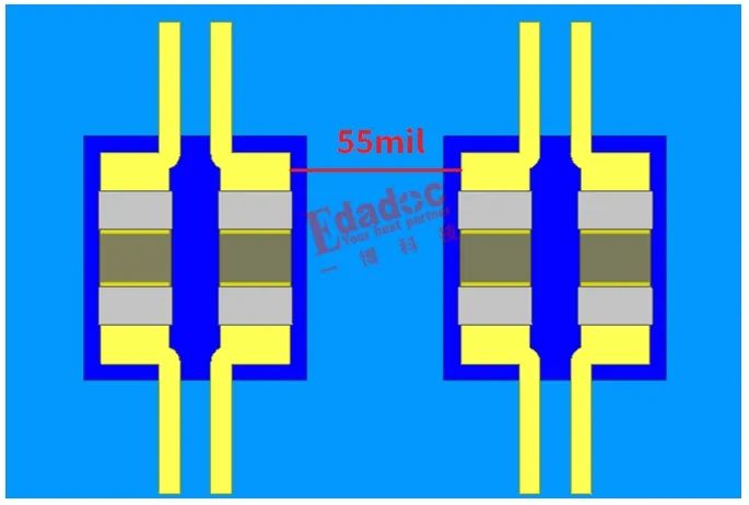 可以看到0mil就是代表这上图的那个初始的距离,在我们大家做得比较多的28Gbps高速信号这个情况下,基频在14GHz串扰大概33dB的样子,当然拉开到100mil那么远之后串扰直线下降到70dB这个非常非常理想的值了。当然Chris盲猜大多数的你们也真是没有那么多空间能把两对电容拉到100多mil的gap吧。那到底拉大到多少才合适呢?这个就看大家对裕量的安全感认知了,当然也看不同高速信号的裕量了。在28Gbps的高速信号中,Chris认为50dB是一个还不错的门槛。对应到上面的仿真结果,也就是橙色的那一条曲线,大概30mil,加上初始的25mil,也就是55mil的焊盘gap。也就是大概下面这个距离哈,大家可以通过模型上的距离来体会下!
