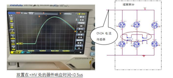 此高精度闭环霍尔传感器放置在此处,起两个主要的作用:1)检测总输出电流,可以用于计算和显示总输出功率;2)起到类似保险管一样的保护作用;一旦某个桥臂的MOS/IGBT损坏,势必会导致+HV与地直通,从而引起短路,此类故障会被迅速的检测出来;