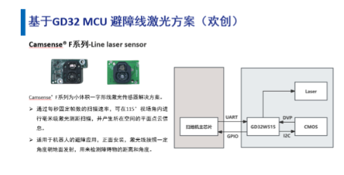 第二款是与合作伙伴欢创联合开发的避障线激光方案,以GD32W515芯片为核心,可同时兼容CMOS与激光传感器。该方案能以固定每秒帧数的扫描速率,在115°视场角内实现毫米级激光测距扫描,并生成空间平面点云信息,为清洁设备避障提供精准数据支持。