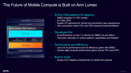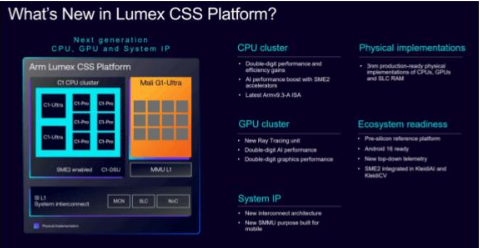 这正是 Arm 推出集成平台的原因,通过将 Arm CPU 和 GPU IP,与物理实现和部署就绪的软件栈相结合,从而加快产品上市进程,并在最新的先进工艺节点上实现业界领先的性能。而 Arm Lumex 就是Arm 新的专用计算子系统 (Compute Subsystem, CSS) 平台,旨在满足旗舰移动设备和 PC 上持续增长的端侧 AI 体验需求。
