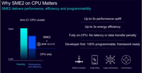在 CPU 方面,启用 SME2 技术的 Armv9.3 C1 CPU 集群结合了 Arm KleidiAI 对主流框架和运行时库的原生支持,在包括典型机器学习 (ML) 推理、语音及生成式 AI 等在内的广泛 AI 工作负载中,相较于上一代 CPU 集群,在相同条件下实现了显著的速度提升。同时带来了五倍的 AI 性能提升,以及三倍的能效优化。这些基于 SME2 的改进使得用户能在其常用的消费类电子设备上享受更流畅的 AI 交互体验,并获得更长的续航时间。