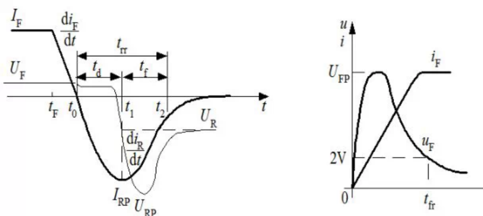 二极管反向恢复干扰:开关电源中整流、续流二极管工作在开关状态,导通时产生高压尖峰 VFP,关断时因反向恢复时间 trr 及封装、引线电感,出现反向电压尖峰 VRP 与瞬变反向恢复电流 IRP,成为电磁干扰根源。