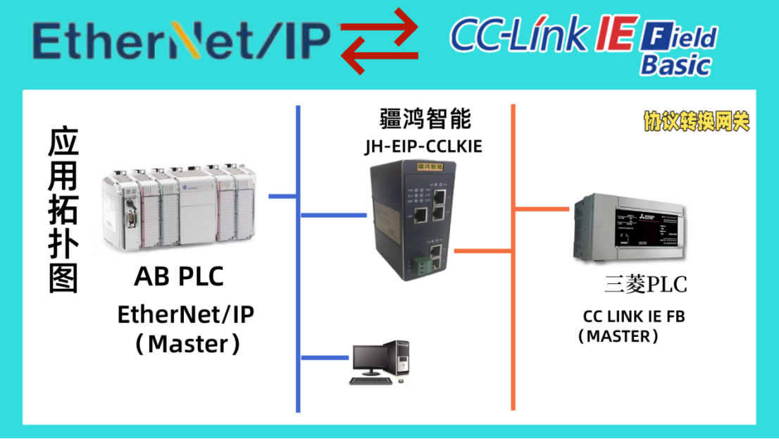 疆鸿智能JH-EIP-CCLKIE型网关实现CC-Link IE Field Basic网络与EtherNet/IP网络之间的数据通讯,即CC-Link IE Field Basic和EtherNet/IP网络之间无缝内部连接。