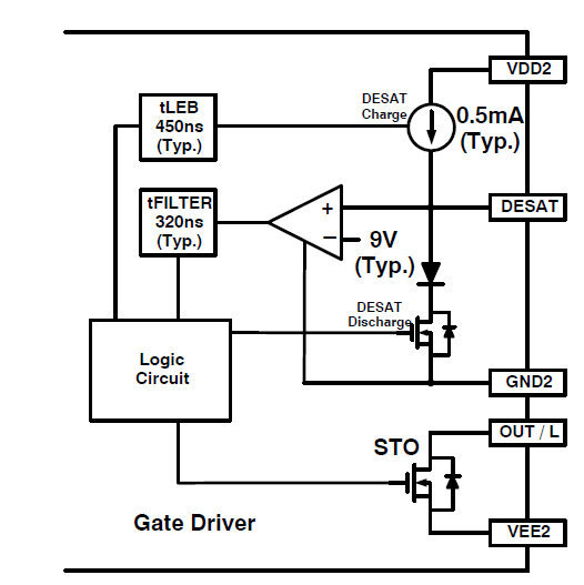 NCD57000 集成了去饱和检测功能, 当 VCESAT 达到设定阈值时, 内部的 STO(软关断) MOSFET 会被激活, 对栅极电容放电, 以降低因高 dV/dt 引起的过压应力和损耗。