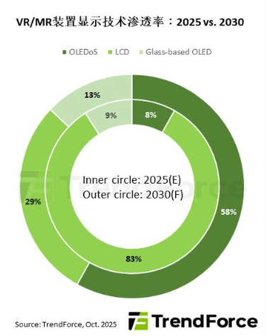 另一大厂Meta在强化自家生态系的同时,计划采用0.9吋OLEDoS搭配Pancake光学架构的组合,以突破现有产品形态限制,满足VR/MR的轻薄化需求。TrendForce集邦咨询预期,在成本与技术双重优化下,OLEDoS有望从中高阶市场逐步向主流市场渗透,成为推动VR/MR产业转型升级的重要驱动力。