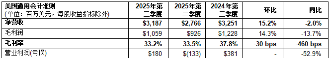 - ?“与去年同期相比,第三季度净营收下降 2.0%,非美国 GAAP 营业利润率从 11.7% 降至 6.8%,非美国 GAAP1 净利润从 3.51 亿美元降至 2.67 亿美元。