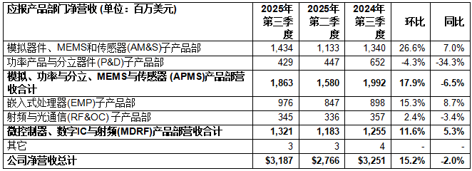 意法半导体第三季度实现净营收31.9亿美元,毛利率33.2%,营业利润1.80亿美元,净利润2.37亿美元,每股摊薄收益-0.26美元(非美国通用会计准则1营业利润为2.17亿美元,非美国通用会计准则1净利润为 2.67亿美元,每股摊薄收益0.29美元)。