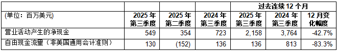 第三季度经营活动产生净现金 5.49 亿美元,低于去年同期的 7.23 亿美元