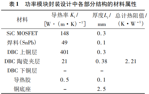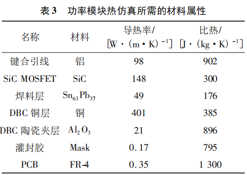 在对整个功率模块的封装设计完成后,便可以对包含在整机外壳内的单个功率模块进行热仿真。功率模块热仿真所需的材料属性如表 3所示。