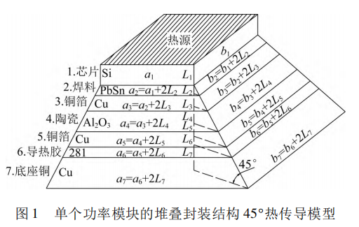 本次研究的功率模块采用堆叠结构,发热量和环境极限温度要求较高。基板采用热性能较FR-4?材料 印 制 电 路 板(?PCB) 更 优 的 覆 铜 陶 瓷(?DBC) 基板。单个功率模块的堆叠封装结构?45°热传导模型如图?1所示[6]。