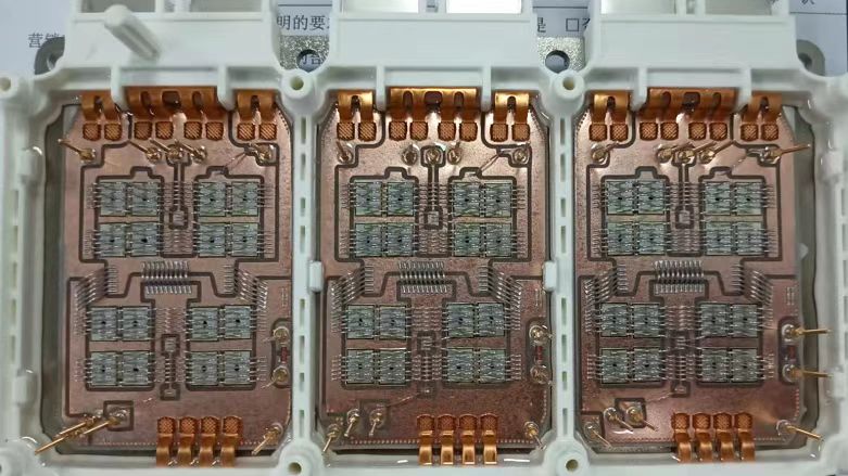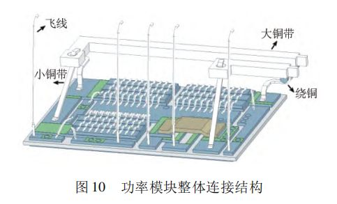 但除了键合引线,功率模块还存在着与驱动层、负载侧连接的铜引线、铜带。功率模块整体连接结构如图?10?所示。这些铜导体引入了大量的寄生电阻、寄生电感。由于本文主要针对热分析,所以仅讨论寄生电阻的影响。