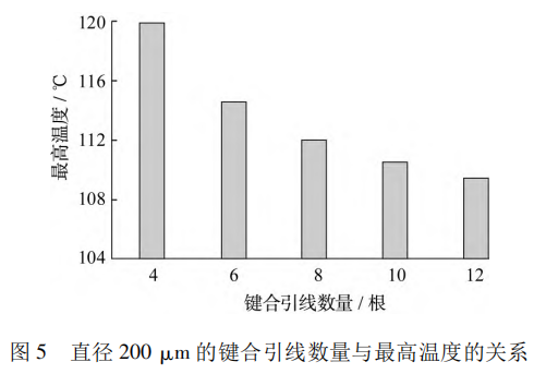 在确认键合方式之后,键合丝的数量、直径和布局也会对键合引线的总电阻有所影响。直径200?μm的键合引线数量与最高温度的关系[7]如图?5?所示。参考图?5?统计结果可以发现,若键合丝直径为?200?μm,那么在?8?根键合引线时所需要的成本较少,且性能表现较好。
