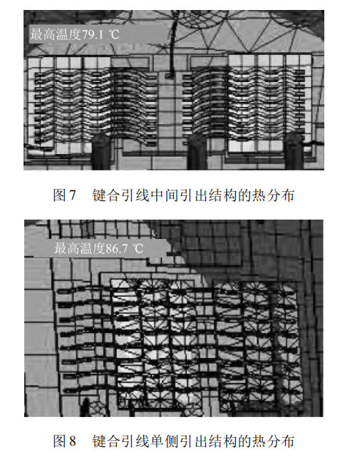 由于单个功率模块中存在多个?SiCMOSFET,所以需要对多芯片键合引线的布局进行设计。多芯片的键合引线结构主要有两种:第一种是采取从两侧到中间的引出结构; 第二种是采取单侧引出的结构。键合引线中间引出结构的热分布如图?7所示; 键合引线单侧引出结构的热分布如图?8?所示。对比图?8?的单侧引出结构,图?7?明显温度分布更加均匀,最高温度值也更低。因此采取中间引出结构,可以降低功率模块的热量聚集,避免局部点过热导致芯片烧毁。