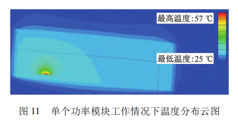 根据测试情况,设置边界条件为自然散热,环境温度25 ℃?。单个功率模块工作情况下温度分布云图如图?11?所示。芯片最高结温为?57 ℃,与理论计算情况相近。