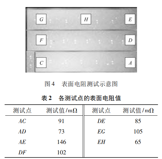 对于该功率模块的封装结构,除了考虑芯片向外部的散热路径,还需要考虑实现芯片功能的键合引线结构。表面电阻测试示意图如图?4?所示。对?SiC MOSFET?裸片进行表面电阻测试,得到各测试点间的表面电阻值。各测试点的表面电阻值如表?2?所示。对于漏源极( 芯片背电极到正面电极) 之间导通电阻仅约?10 mΩ?的芯片,近100 mΩ的表面电阻显然无法接受。实 际 测 试Infineon、Fairchild?等公司的普通?Si MOSFET,一般表面电阻均小于?1 mΩ。若使用现行工艺的单点键合引出,则一方面键合引线的电阻偏大且一致性差; 另一方面芯片表面电流分布不均,易产生热集中点。因此,使用多点连续键合工艺。