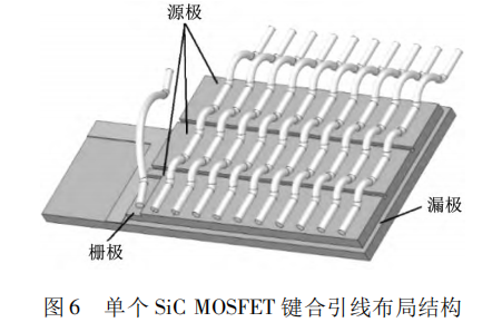 除此之外,还存在直径?380?μm?的键合引线。虽然引线的直径越大,导通电阻越小,但是考虑到封装空间有限,能够并联的数量也会减小。6?根直径?380?μm?键合引线并联的仿真最高温度是123. 42 ℃,与?8?根直径?200?μm?键合引线并联效果 相 比 反 而 更 差,从而得到理想的单个SiC MOSFET?键 合 引 线 布 局 结 构。?单 个SiC MOSFET键合引线布局结构如图?6?所示。