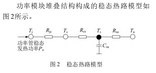 图?2?中,Tj为芯片结温;?Rjc为芯片结到壳体的热阻,在图?1?中对应?2 ~ 5?层的封装结构,热路关系类似电阻的串联;?Tc为封装壳体的温度;?Rcs为封装壳体到散热器的热阻,对应?6?层、7?层。SiCMOSFET?功率模块整机封装结构如图?3?所示。