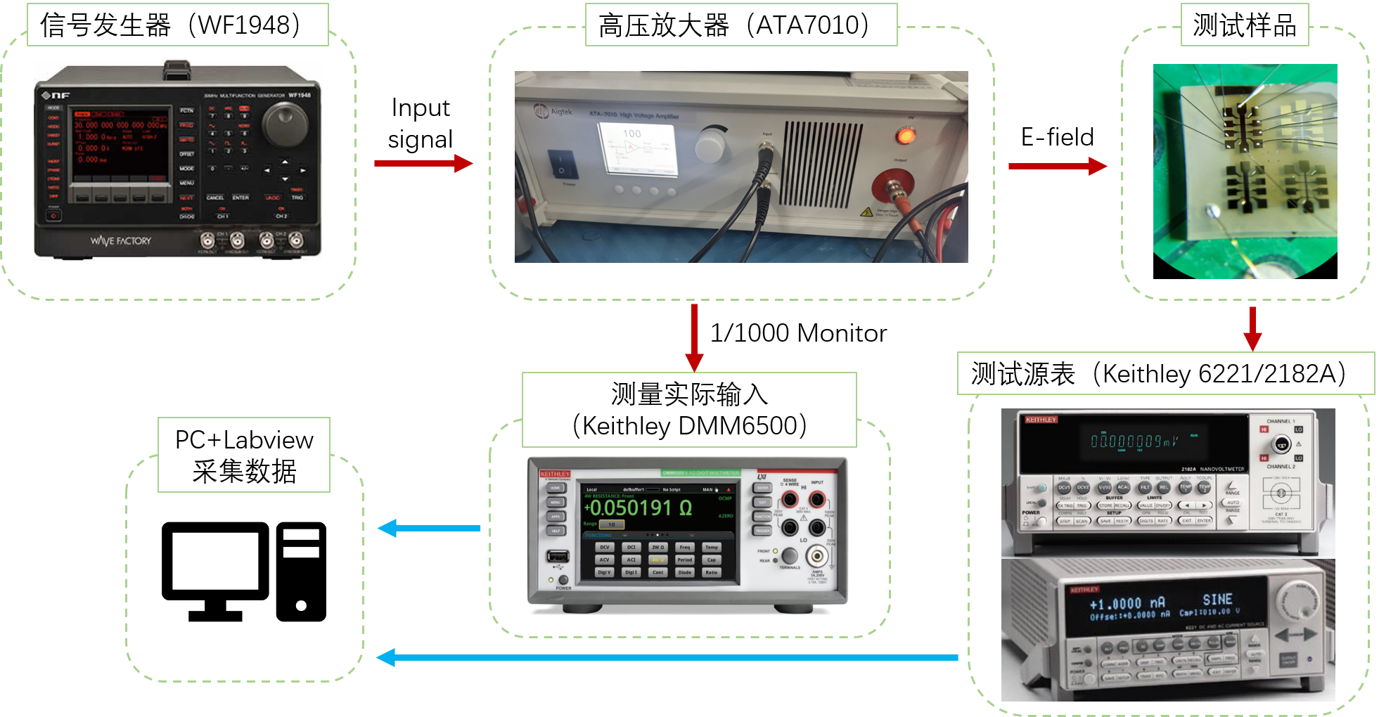 测试设备:信号发生器,ATA-7010高压放大器,电流源,纳伏表,数字万用表等