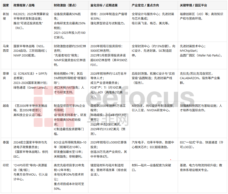 除了税收,还有从“单点优惠”走向“平台化的能力”:新加坡通过国家级研发制造设施与JID,强化原型/试制/试验验证的“公共底座”;马来西亚以先进封装技术中心、Fab Parks与MYChipStart,试图把孤立项目汇聚为“可复制”的生态;泰国用EEC做集聚化与一站式服务;菲律宾把政策、园区与国际合作串接,形成“封测—研发—先进封装”爬坡通道;印尼与越南则在“硬件底座”(电力、园区、海港)与“人力资本”(人才KPI)上布局长期能力。
