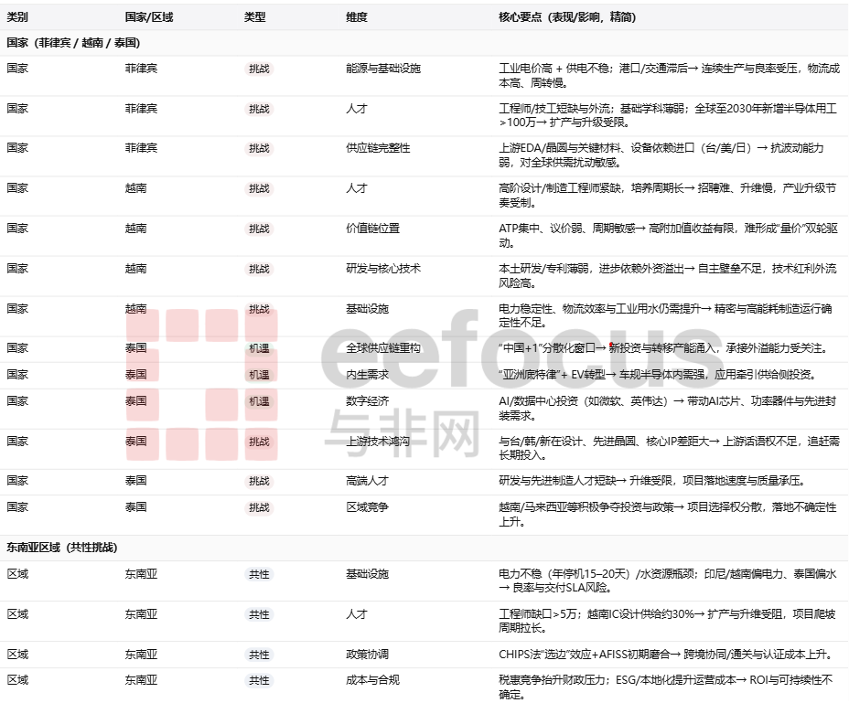 在区域层面,东南亚面临“基础设施—人才—政策协同”的三角挑战。电力与水的确定性直接决定良率与交付SLA,最佳实践是以园区为最小单元,明确并网容量、储能与水循环的SLA指标;人才缺口需以国家级培养指标与校企联合实训同步推进;政策端要处理CHIPS法“选边”外溢与AFISS一体化早期磨合,尽快在ESG互认、跨境通关与认证协同上打通关节。总体而言,谁能最先跑通“政策红利—园区能力—人才供给—合规体系”的闭环,谁就能把项目承诺转化为可交付产能。短期看,泰国凭借“内需+新基建”具备承接外溢的优势;中期若越南补齐高技能人才并形成示范线,有望向设计/研发延伸;菲律宾一旦电力成本与稳定性拐点确立,同时推进本地化研发与材料混配,后端产能释放与韧性提升将更为可期。