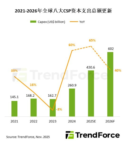 随着北美云端服务大厂(CSP)近日公布最新财报指引,TrendForce集邦咨询将2025年全球八大主要CSPs资本支出(CapEx)总额年增率从原本的61%,上修至65%。预期2026年CSPs仍将维持积极的投资节奏,合计资本支出将进一步推升至6,000亿美元以上,年增来到40%,展现出AI基础建设的长期成长潜能。