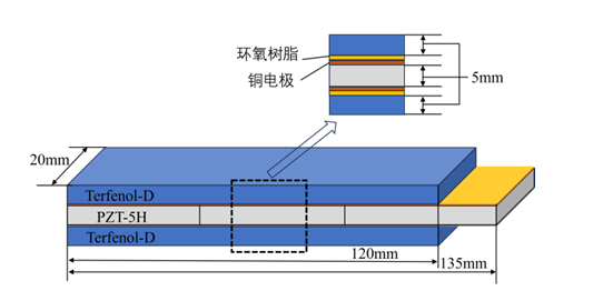 功能材料:PZT-5H压电陶瓷(135mm×20mm×5mm)、Terfenol-D磁致伸缩材料(120mm×20mm×5mm)、铷铁硼永磁体(20mm×20mm×10mm,提供偏置磁场)、环氧树脂AB胶(粘合功能层)、铜箔(制作电极)、银(Ag)电极层(压电材料预处理)。