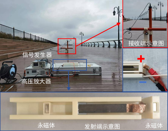 1、根据磁电机械天线的辐射机理搭建实验测试平台,由信号发生器作为激励源输出与天线谐振频率相符的正弦激励信号,经由高压放大器放大,输入到压电材料中,经由中间环氧树脂层的过渡,将振动传导至磁化的磁致伸缩层,由此辐射出磁场信号。接收端采用三轴磁传感器,经过信息的存储和后期处理得到信号的频率与强度信息。