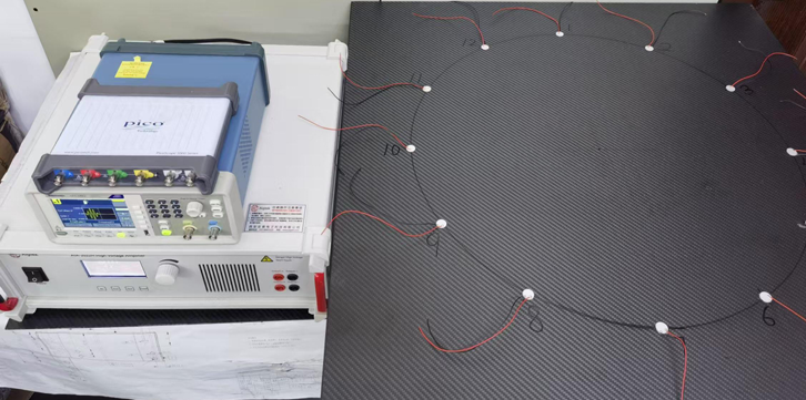 实验原理:为了探索改进E-RAPID算法在CFRP材料上的有效性,本章依托实验室现有的设备,搭建完整的结构健康监测系统对CFRP材料损伤检测进行了实验验证,在准备好的CFRP材料板件上预制通孔损伤,探究合适的传感器阵列通过信号发生器产生汉明窗调制的五周期激励信号,利用功率放大器对压电陶瓷换能器进行驱动,在板件表面激发Lamb波并通过示波器连接PC端进行响应信号实时采集,在PC端上进行数据存储与信号后处理。实验探究改进E-RAPID算法在复合材料板损伤定位的可行性,探索模拟损伤材料的实际效果,试图为CFRP结构健康监测领域提供新的损伤定位思路。