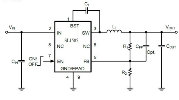 SL1585是一款高频、同步、整流、降压、开关模式转换器,内置电源MOSFETs。它提供了一种非常紧凑的解决方案来在宽输入电源范围内实现4A峰值输出电流,具有出色的负载和线路调节能力。