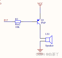 单片机也是VCC供电都是5V,Q1为PNP型三极管,当P17输出高电平时,Q1不导通,LS1蜂鸣器不响,当P17输出低平时,Q1导通,LS1蜂鸣器响起报警。PNP型三极管的导通条件不懂的可以百度搜索,