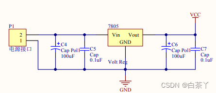 从电源接口进来,过C4 、C5电容滤波,再经过7805LDO芯片,C6、C7容滤波,出一个5V的VCC电源给单片机与LCD12864供电。