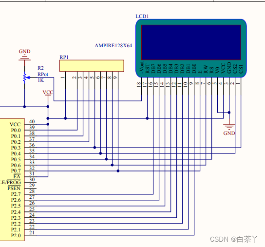 LCD12864液晶显示屏,购买器件时查看相对应的器件规格书,里面会有器件的参数以及每个引脚的功能介绍,也会有参考电路提供。这部分电路主要功能是显示单片机的工作状态,显示的内容与程序相关,一共用到2组IO口,P0、P2口。