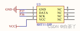 U3为SHT11传感器,1脚GND,2脚DATA为信号传输脚(把检测到的型号传给MCU),3脚SCK时钟,4脚VCC供电。NC为不接(注:原理图的器件引脚要对应实际器件)