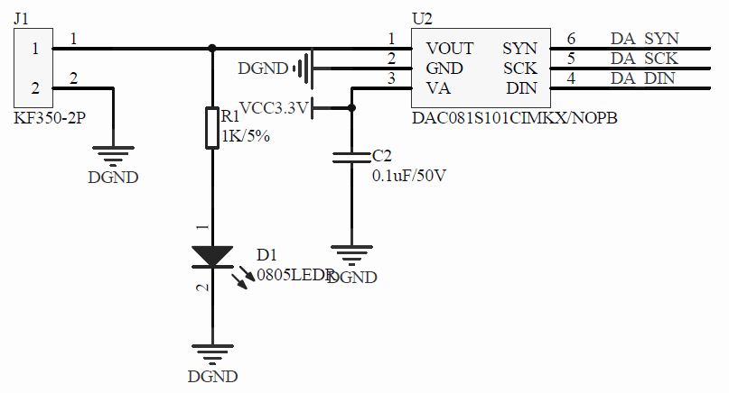本实验练习使用DA,实验中使用的芯片型号为DAC081S101,最大采样率为30MHz,精度为8位。