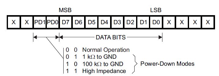 图2所示是DAC驱动时序图;图3所示是DAC芯片16位数据输入格式,D7~D0是需要转换的电压数据,PD1~PD0是DAC掉电模式选择,本实验选择通用模式00。D7~D0表示十进制值的大小范围是0~255,本实验通过输入0~255循环递增的值使DAC芯片输出电压由0递增至最大,使LED灯的亮度由暗至亮循环变化。