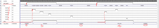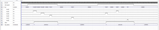 start_signal为启动信号,高电平表示可以抢答,下图中最先抢答的是5号,故数码管信号deg_display显示"10010010"对应5,当start_signal为低电平表示不可以抢答,此时按下没有反应。下一次抢答,第一次抢答者为4号,数码管显示"10011001",对应4.下图alarm表示蜂鸣器信号,高电平响。