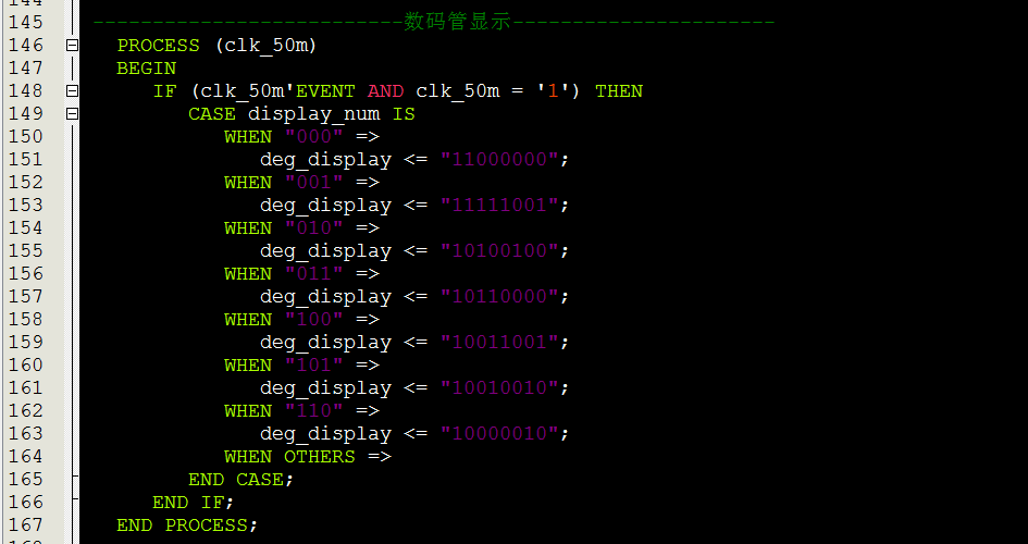 LIBRARY?ieee; ???USE?ieee.std_logic_1164.all; ENTITY?state_ctrl?IS ???PORT?( ??????clk_50m???????:?IN?STD_LOGIC; ??????key???????????:?IN?STD_LOGIC_VECTOR(5?DOWNTO?0);--6个抢答按键,所有key都是高电平有效 ??????start_signal??:?IN?STD_LOGIC;--启动信号 ??????deg_display???:?OUT?STD_LOGIC_VECTOR(7?DOWNTO?0);--数码管 ??????alarm?????????:?OUT?STD_LOGIC--板子上没有蜂鸣器,用led灯亮模拟 ???); END?state_ctrl; ARCHITECTURE?trans?OF?state_ctrl?IS ??? ???SIGNAL?current_state?:?STD_LOGIC_VECTOR(3?DOWNTO?0)?:=?"0000"; ???SIGNAL?next_state????:?STD_LOGIC_VECTOR(3?DOWNTO?0)?:=?"0000"; ??? ???SIGNAL?display_num???:?STD_LOGIC_VECTOR(2?DOWNTO?0)?:=?"000"; ???SIGNAL?control_data??:?STD_LOGIC_VECTOR(7?DOWNTO?0)?:=?"00000000"; BEGIN ------------------------------------状态机---------------------------- ???PROCESS?(clk_50m) ???BEGIN ??????IF?(clk_50m'EVENT?AND?clk_50m?=?'1')?THEN ?????????IF?(start_signal?=?'0')?THEN ????????????current_state?<=?"0000"; ?????????ELSE ????????????current_state?<=?next_state; ?????????END?IF; ??????END?IF; ???END?PROCESS; ??? ???PROCESS?(clk_50m) ???BEGIN IF?(clk_50m'EVENT?AND?clk_50m?=?'1')?THEN ??????CASE?current_state?IS ?????????WHEN?"0000"?=>--未开始抢答状态 ????????????IF?(start_signal?=?'1')?THEN ???????????????next_state?<=?"0001"; ????????????ELSE ???????????????next_state?<=?"0000"; ????????????END?IF; ?????????WHEN?"0001"?=>--开始抢答状态 ????????????IF?(key(0)?=?'1'?OR?key(1)?=?'1'?OR?key(2)?=?'1'?OR?key(3)?=?'1'?OR?key(4)?=?'1'?OR?key(5)?=?'1')?THEN ???????????????next_state?<=?"0010"; ????????????ELSE ???????????????next_state?<=?"0001"; ????????????END?IF; ?????????WHEN?"0010"?=>--抢答状态 ????????????CASE?key?IS ???????????????WHEN?"000001"?=> ??????????????????next_state?<=?"0011"; ???????????????WHEN?"000010"?=> ??????????????????next_state?<=?"0100"; ???????????????WHEN?"000100"?=> ??????????????????next_state?<=?"0101"; ???????????????WHEN?"001000"?=> ??????????????????next_state?<=?"0110"; ???????????????WHEN?"010000"?=> ??????????????????next_state?<=?"0111"; ???????????????WHEN?"100000"?=> ??????????????????next_state?<=?"1000"; ???????????????WHEN?OTHERS?=> ??????????????????next_state?<=?"0010"; ????????????END?CASE; ?????????WHEN?"0011"?=>--1号抢答 ????????????IF?(start_signal?=?'0')?THEN ???????????????next_state?<=?"0000"; ????????????ELSE ???????????????next_state?<=?"0011"; ????????????END?IF; ?????????WHEN?"0100"?=>?--2号抢答 ????????????IF?(start_signal?=?'0')?THEN ???????????????next_state?<=?"0000"; ????????????ELSE ???????????????next_state?<=?"0100"; ????????????END?IF; ?????????WHEN?"0101"?=>?--3号抢答 ????????????IF?(start_signal?=?'0')?THEN ???????????????next_state?<=?"0000"; ????????????ELSE ???????????????next_state?<=?"0101"; ????????????END?IF; ?????????WHEN?"0110"?=>--4号抢答 ????????????IF?(start_signal?=?'0')?THEN ???????????????next_state?<=?"0000"; ????????????ELSE ???????????????next_state?<=?"0110"; ????????????END?IF;