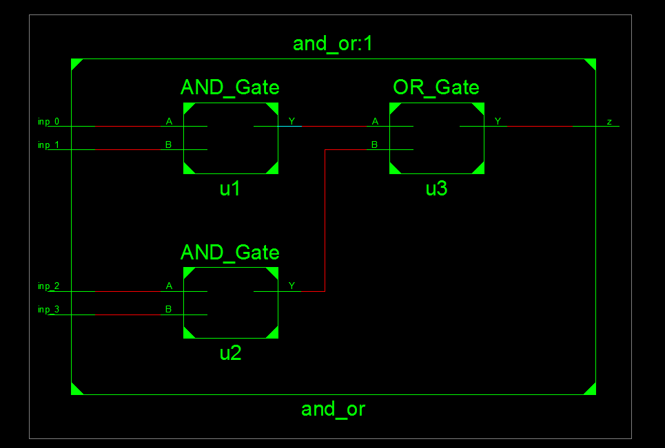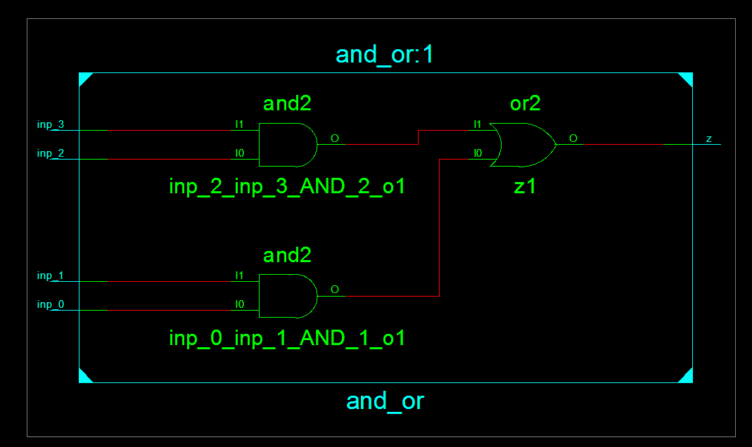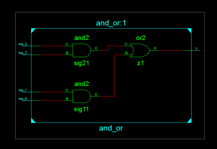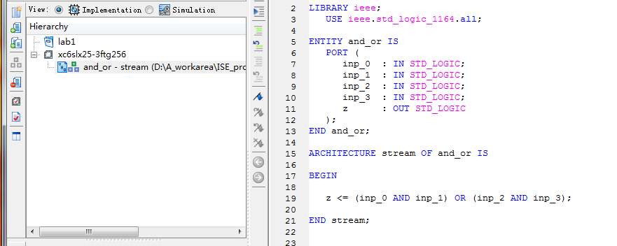 LIBRARY?ieee; ???USE?ieee.std_logic_1164.all; ENTITY?and_or?IS ???PORT?( ??????inp_0??:?IN?STD_LOGIC; ??????inp_1??:?IN?STD_LOGIC; ??????inp_2??:?IN?STD_LOGIC; ??????inp_3??:?IN?STD_LOGIC; ??????z??????:?OUT?STD_LOGIC ???); END?and_or; ARCHITECTURE?behave?OF?and_or?IS ??? ???SIGNAL?sig1?:?STD_LOGIC; ???SIGNAL?sig2?:?STD_LOGIC; BEGIN ??? ???sig1?<=?inp_0?AND?inp_1; ???sig2?<=?inp_2?AND?inp_3; ??? ???z?<=?sig1?OR?sig2; ??? END?behave;