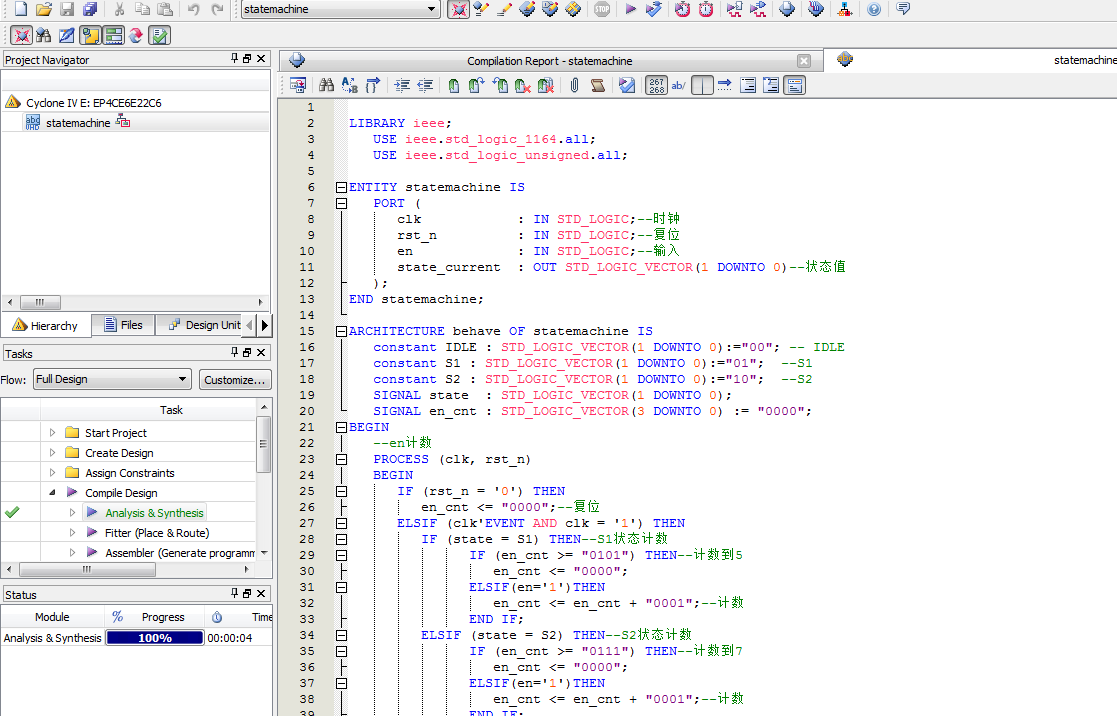 内容:状态机有三个状态,IDLE,S1和S2。在IDLE状态如果en=1,则跳到S1状态,否则保持不变;在S1状态时,统计en=1的次数,如果达到5次,则跳到S2状态,否则保持不变;在S2状态,统计en=1的次数,如果达到7次,则跳回到DLE状态,否则保持不变。(注:全部信号都是同步信号,即与时钟同步)(en可以是单周期脉冲,也可是多周期脉冲。