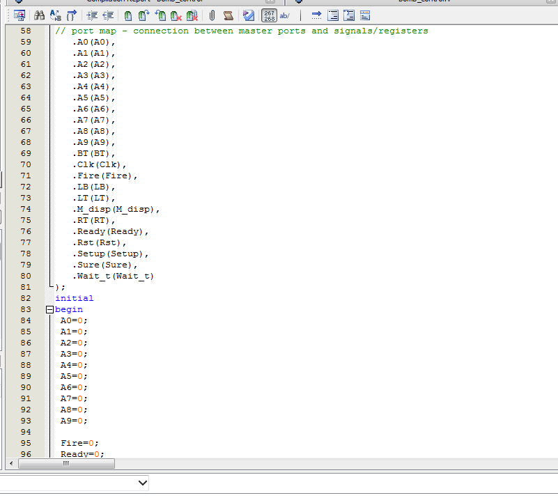 /数字密码启动器具体设计要求: //1、 数子密码启动器采用 4 个十进制数,输入密码时通过数码管显示当前输入的数字 //2、 当 4 位密码输入正确后(初始密码为可自定义 4 位十进制数,报告中请写明),系统可 //以正确启动启动装置;当密码输入错误(多一位、少一位或错误)时,系统给出警报 //3、 系统复位后处于等待状态,按下 Ready 键后,准备就绪,可以输入密码。 //4、 密码输入正确后,可以启动 //5、 密码输入错误时,系统给出警报,红灯闪烁,蜂鸣器响,此时 Ready 和 Wait_t 无效,必 //须由安保人员重新设置到等待状态 //6、 启动事件发生后,系统应重新回到等待状态 //7、 十个数字键作为密码输入 module bomb_control( input Clk,//标准时钟信号 25khz input Rst,//复位后出于等待状态,低有效 input Wait_t,//进入密码输入状态时,在密码输入完毕确认前,可通过 Wait_t 回到等待状态,密码确认后,该按键无效 input Setup,//错误重建信号,密码输入错误时,系统给出警报,红灯闪烁,蜂鸣器响,此时 Ready 和 Wait_t 无效,必须由安保人员重新设置到等待状态 input Ready,//就绪后可输入密码 input Fire,//且仅当密码输入正确时有效,其余情况按下该按键进入警报 input Sure,//密码输入完毕,确认 input A0,//密码输入按键 input A1,//密码输入按键 input A2,//密码输入按键 input A3,//密码输入按键 input A4,//密码输入按键 input A5,//密码输入按键 input A6,//密码输入按键 input A7,//密码输入按键 input A8,//密码输入按键 input A9,//密码输入按键 output??LT,//密码输入正确,绿灯亮,高有效 output??BT,//启动成功,黄灯亮,高有效 output??RT,//密码输入错误,红灯以 1hz 频率闪烁 output??LB,//密码错误,蜂鸣器响 output [3:0] M_disp//当前输入数字 ); parameter mima=16'h5643;//定义初始密码为5643 //定义4个寄存器储存输入密码 reg [15:0] number_mima=16'd0;