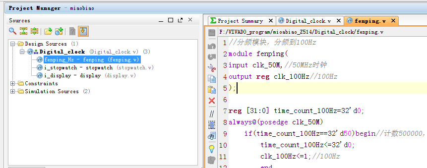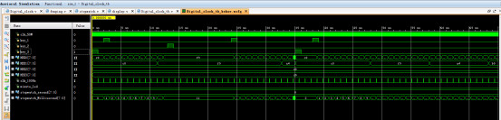 module?Digital_clock( input?clk_50M, input?key_1,//启动(A) input?key_2,//暂停(B) input?key_3,//复位(C) output?minute_led,//分用led显示 output??[7:0]?HEX0,//数码管-低亮 output??[7:0]?HEX1,//数码管-低亮 output??[7:0]?HEX2,//数码管-低亮 output??[7:0]?HEX3//数码管-低亮 ); wire?[7:0]?stopwatch_Millisecond;//10毫秒 wire?[7:0]?stopwatch_second;//秒 wire?clk_100Hz; //分频模块 fenping?fenping_Hz( .?clk_50M(clk_50M), .?clk_100Hz(clk_100Hz) ); //秒表控制模块 stopwatch?i_stopwatch( .?clk_50M(clk_50M), .?clk_100Hz(clk_100Hz),//100Hz--对应10ms .?start_key(key_1),//启动 .?stop_key(key_2),//暂停 .?reset_key(key_3),//复位 .?stopwatch_Millisecond(stopwatch_Millisecond),//10毫秒 .?stopwatch_second(stopwatch_second),//秒 .?minute_led(minute_led)//分 ); //显示模块 display?i_display( .?clk(clk_50M), .?stopwatch_Millisecond(stopwatch_Millisecond),//10毫秒 .?stopwatch_second(stopwatch_second),//秒 .?HEX0(HEX0),//数码管-低亮 .?HEX1(HEX1),//数码管-低亮 .?HEX2(HEX2),//数码管-低亮 .?HEX3(HEX3)//数码管-低亮 ); endmodule