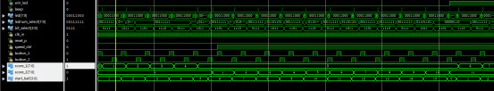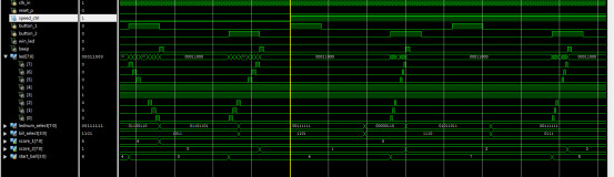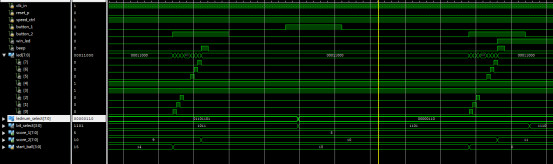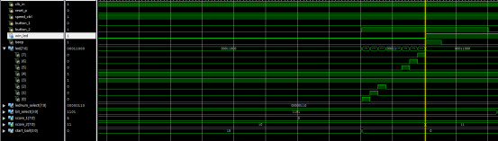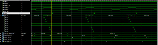 `timescale?1ns?/?1ps //游戏控制模块 module?game_ctrl( ????input?clk_in, ????input?reset_p,//复位,裁判 ????input?button_posedge_1,//甲,按键1 ????input?button_posedge_2,//乙,按键2 ?input?shift_en,? ????output?[7:0]?led,//8个led ?output?reg?win_led,//一局结束指示 ?output?reg?beep,//高电平响 ????output?[7:0]?score_1,//分数1 ????output?[7:0]?score_2//分数2 ????); reg?[7:0]?led_buf=8'd0; //定义状态 parameter?s_idle=4'd0; parameter?s_start_1=4'd1; parameter?s_start_2=4'd2; parameter?s_run_L=4'd3; parameter?s_run_R=4'd4; parameter?s_win_1=4'd5; parameter?s_win_2=4'd6; parameter?s_end=4'd7; reg?[3:0]?state=4'd0; reg?[3:0]?start_ball=4'd0;//发球计数,每人5次,0~4甲,5~9乙。 always@(posedge?clk_in)//发球计数 if(start_ball<5)//发球计数,每人5次,0~4甲 if(button_posedge_1==1) start_ball<=start_ball+1; else ; else//发球计数,每人5次,5~9乙。 if(button_posedge_2==1) start_ball<=start_ball+1; else ; //状态机设计 always@(posedge?clk_in) if(reset_p==1) ????state<=s_idle; else ????case(state) ???????s_idle:begin//初始状态 ????????????led_buf<=8'd0; ????????????if(start_ball<5?&&?button_posedge_1==1)//1号发球 ????????????????state<=s_start_1; ????????????else?if(start_ball>4?&&?button_posedge_2==1)//2号发球 ????????????????state<=s_start_2; ????????????else ????????????????state<=s_idle; ????????????end ??????s_start_1:begin//1号发球起始位置 ????????????state<=s_run_R; ????????????led_buf<=8'b10000000; ????????????end ??????s_start_2:begin//2号发球起始位置 ????????????state<=s_run_L; ????????????led_buf<=8'b00000001; ????????????end?? ??????s_run_R:begin//球右移 ????????????if(shift_en) ???????????????led_buf<=led_buf>>1;//球右移 ????????????else ???????????????led_buf<=led_buf;?? ?????? ????????????if(button_posedge_2==1) ????????????????if(led_buf==8'b00000001)//判断对方是否正确位置击球?????????? ????????????????????state<=s_run_L;//改变方向 ????????????????else ????????????????????state<=s_win_1;//否则得分 ????????????else?if(led_buf==8'b00000000)//对方未在正确位置击球 ????????????????????state<=s_win_1; ????????????????else ????????????????????state<=s_run_R; ????????????end ??????s_run_L:?begin//球左移 ????????????if(shift_en) ????????????????led_buf<=led_buf<<1;//球左移 ????????????else ????????????????led_buf<=led_buf;? ???????????????? ????????????if(button_posedge_1==1) ????????????????if(led_buf==8'b10000000)//判断对方是否正确位置击球??????????? ????????????????????state<=s_run_R;//改变方向 ????????????????else ????????????????????state<=s_win_2;//否则得分 ????????????else?if(led_buf==8'b00000000)//对方未在正确位置击球 ????????????????????state<=s_win_2; ????????????????else ????????????????????state<=s_run_L;???????? ?????????????end????????? ????????s_win_1: ?if(beep_cnt>=32'd499)//响铃程持续500时钟 state<=s_idle;//返回初始状态 ?else state<=s_win_1; ????????s_win_2: ?if(beep_cnt>=32'd499)//响铃程持续500时钟 state<=s_idle;//返回初始状态 ?else state<=s_win_2; ????????default:; ???endcase //计分 reg?[7:0]?score_1_buf=8'd0; reg?[7:0]?score_2_buf=8'd0; always@(posedge?clk_in) ????if(reset_p==1) ????????score_1_buf<=8'd0; ????else ??if(state==s_win_1?&&?beep_cnt==32'd0) score_1_buf<=score_1_buf+8'd1;//加一分 always@(posedge?clk_in) ????if(reset_p==1) ????????score_2_buf<=8'd0; ????else ????????if(state==s_win_2?&&?beep_cnt==32'd0) ????????????score_2_buf<=score_2_buf+8'd1;//加一分 //任何一方先记满11分获胜 reg?beep_en=0; always@(posedge?clk_in) ????if(reset_p==1)begin ?win_led<=0; ?end ?else ?if(score_1_buf>=8'd11?||?score_2_buf>=8'd11)begin win_led<=1;//任何一方先记满11分获胜 end ?else?begin win_led<=0; end //得分自动响铃 reg?[31:0]?beep_cnt=32'd0; always@(posedge?clk_in) if(reset_p==1) beep_cnt<=32'd0; else if(state==s_win_1?||?state==s_win_2) beep_cnt<=beep_cnt+32'd1; else beep_cnt<=32'd0; always@(posedge?clk_in) if(reset_p==1) beep<=30; else if(state==s_win_1?||?state==s_win_2) beep<=1;//得分自动响铃 else beep<=0; assign?score_1=score_1_buf; assign?score_2=score_2_buf; assign?led=led_buf?|?8'b00011000;//中间2个作为中网 endmodule