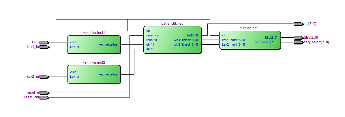 亮点移到任一方终端二极管时,这一方就获胜,此时双方按钮均无作用,输出保持,只有复位后才使亮点恢复到中心。用数码管显示获胜者的盘数。