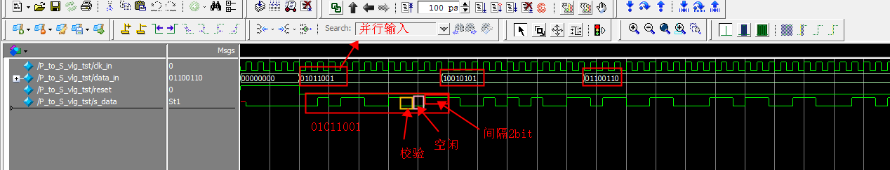 采用时序结构设计并行数据到串行数据编码器转换,输入为8位并行二进制码,输入频率为1MHz,要求把输入码转换为转换为大端模式(高位在前)码速率速率为12MHz/s的串行码,8位数据后加入1位校验位,一个空闲位,帧间隔2位,帧间隔期间数据为高电平,要求通过仿真验证。