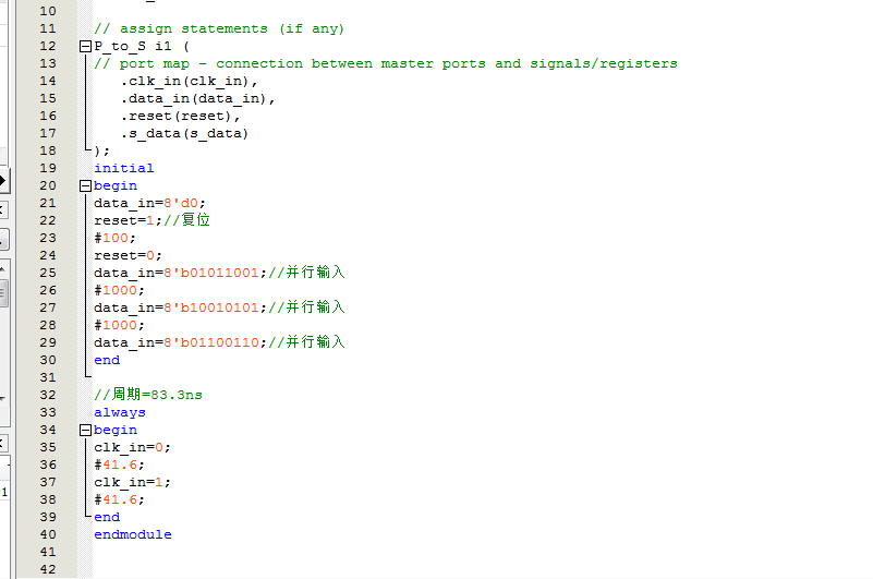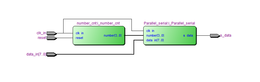 //并串转换 module?P_to_S( input?clk_in,//12MHz input?reset,//复位 input?[7:0]?data_in,//8位并行信号,1MHz output?s_data//1bit,12MHz,串行输出 ); wire?[3:0]?number;//计数输出 //12进制计数器 number_cnt?i_number_cnt( .?clk_in(clk_in),//12MHz .?reset(reset),//复位 .?number(number)//计数输出 ); //并串转换模块 Parallel_serial?i_Parallel_serial( .?clk_in(clk_in),//12MHz .?number(number),//计数输出 .?data_in(data_in),//8位并行信号,1MHz .?s_data(s_data)//1bit,12MHz,串行输出 ); endmodule
