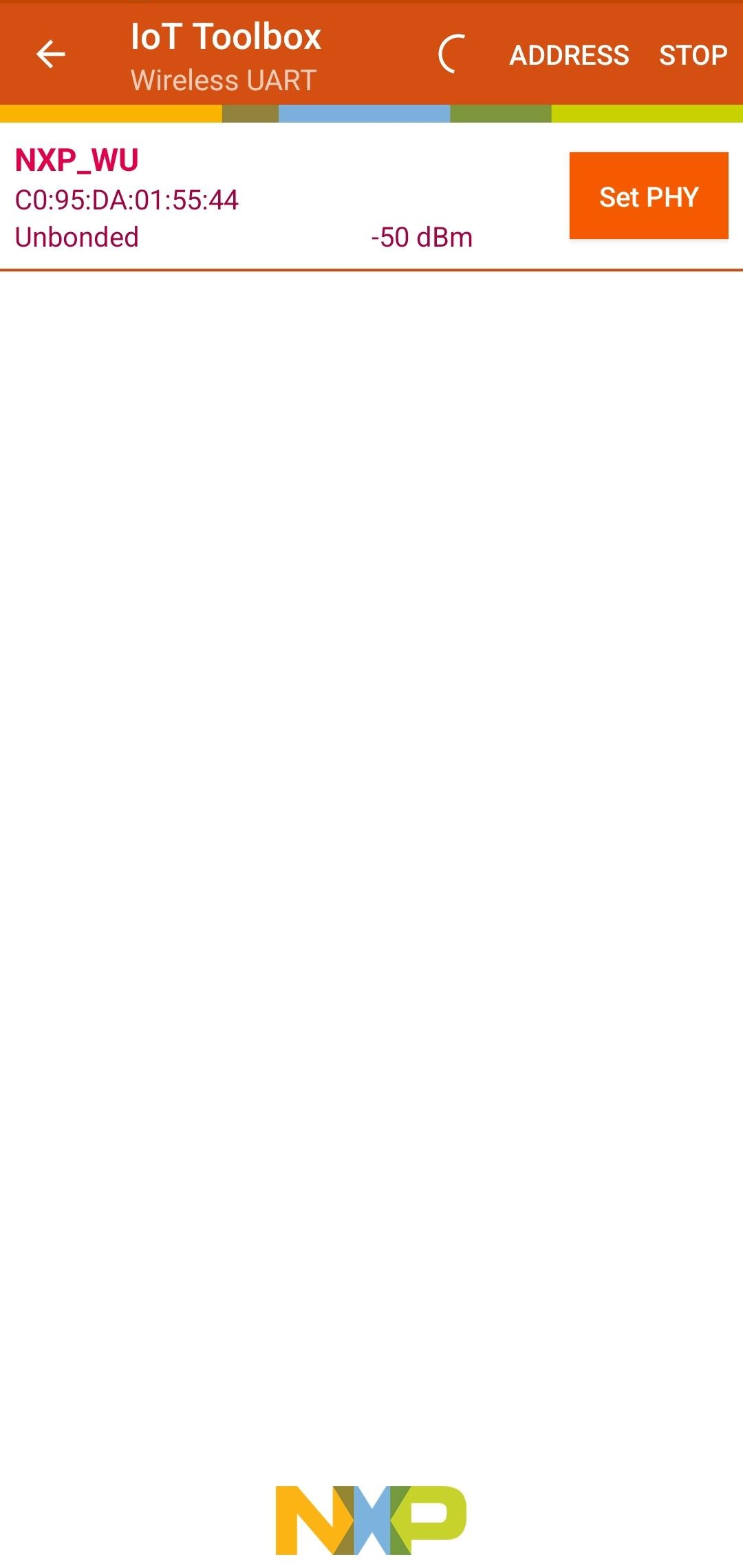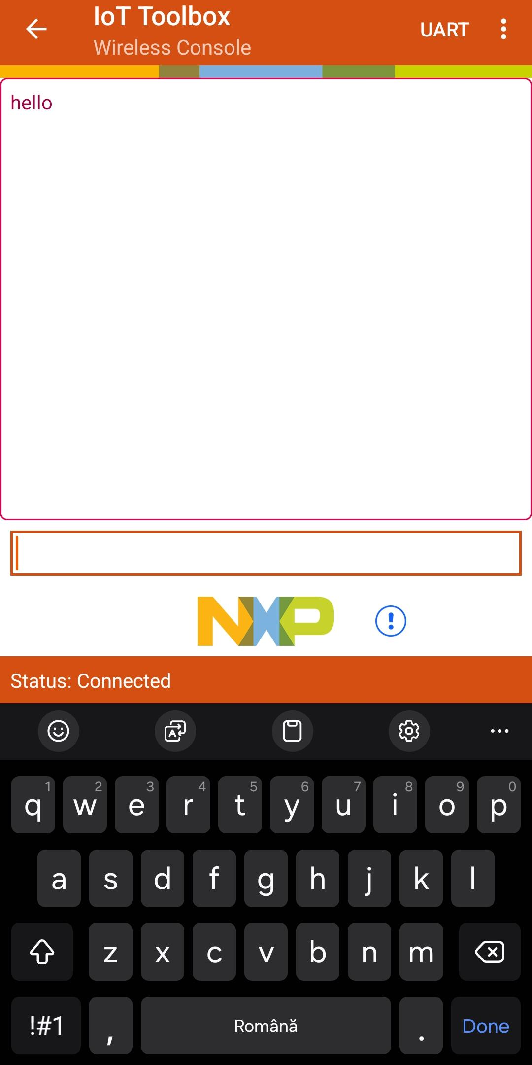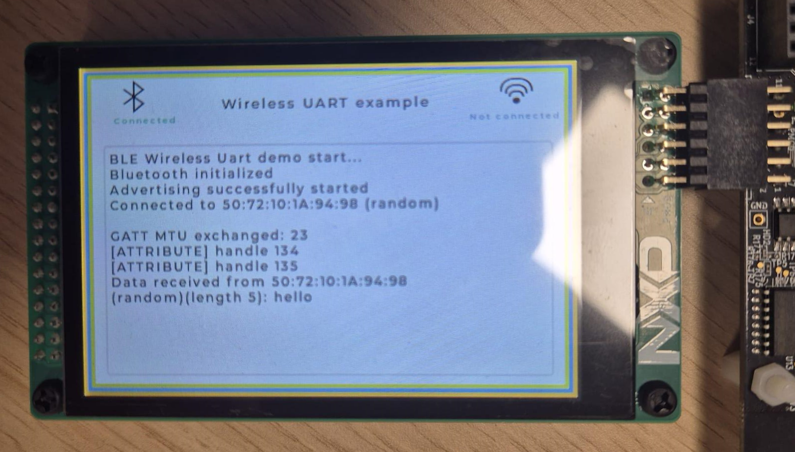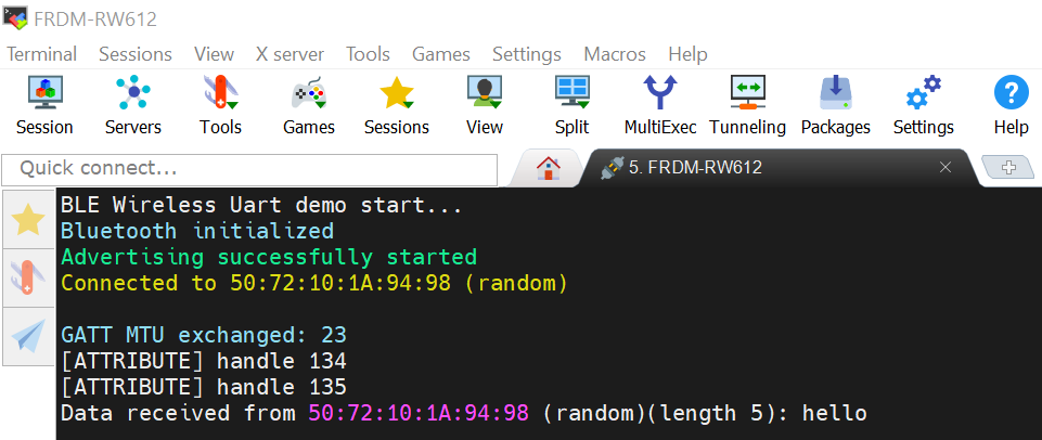 选择无线 UART 示例,然后选择 WU_NXP 设备连接到 FRDM-RW612 开发板。接受配对请求。
