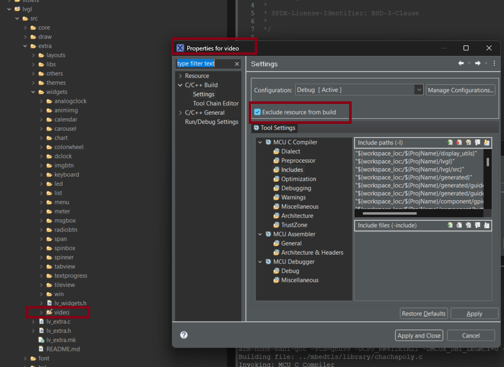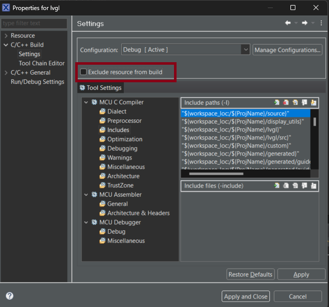 默认情况下,新文件夹(display_utils、generated、lvgl)不会链接到项目中。要添加它们,请右键单击每个文件夹 >“属性”,然后取消选中“从构建中排除资源”: